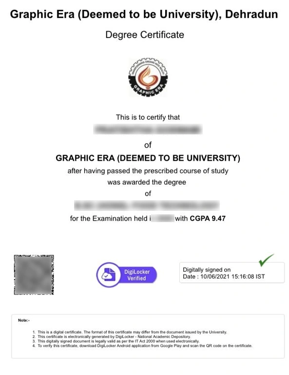 Earn a UGC-recognized degree from Graphic Era Online, complete with the official university seal and registrar’s signature. The certificate is digitally verifiable, ensuring authenticity for jobs and higher education.